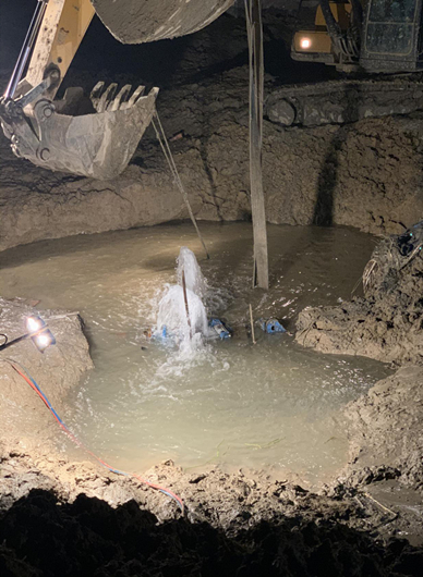 搶修就是命令,時間就是效率。根據公司主要領導安排,于2020年3月15日上午8點40分,朱忠東師傅、嚴慶章師傅等先后帶領我們維修人員、機具、物料進入現場作前期準備,一邊開挖工作坑,一邊抽水機抽水,采取歇人不歇機的辦法保證迅速挖出漏水口。由于農田土質松軟,再加上長時間被水浸泡,導致挖機多次陷入土中,嚴重影響了開挖進度。經驗豐富的嚴師傅立即向指揮部反映,調來了一個大鋼板作為鋪墊,再將挖機置于鋼板上進行操作,順利解決了挖機塌陷的問題。經過了兩個小時的開挖,漏水口終于顯現出來。朱師傅立即換上了“戰服”,“潛入”工作坑為搶修作準備。